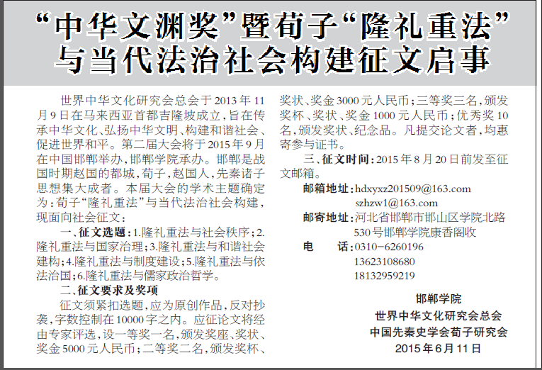 中国光明日报2015611日第6版刊载由世界中华文化研究会总会联合邯郸学院、中国先秦史学会荀子研究会联合举办的中华文渊奖征文启事,欢迎各界人士参照启事踊跃投稿。