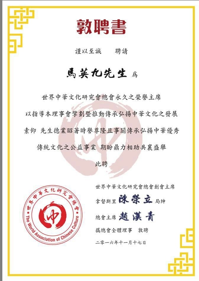 2016年11月17日,台湾地区前领导人马英九先生应邀访问马来西亚,拨冗和总会领导会面,愉快地接受总会敦聘马英九先生为总会永久名誉主席之证书。