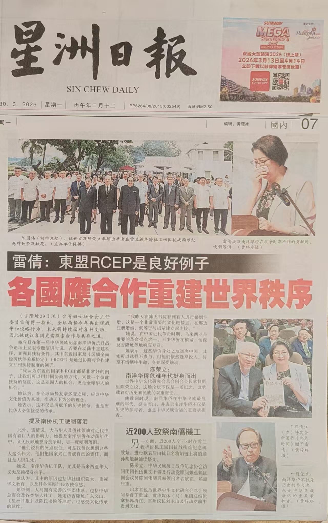 台湾中华妇女联合会主任委员雷倩博士发表专题演讲时,几度因提及南洋华侨的牺牲而哽咽落泪。她指出,在当前全球局势动荡、局部冲突频发的背景下,人类社会正面临前所未有的挑战,各国亟需探索合作共存、重建世界秩序的新路径。