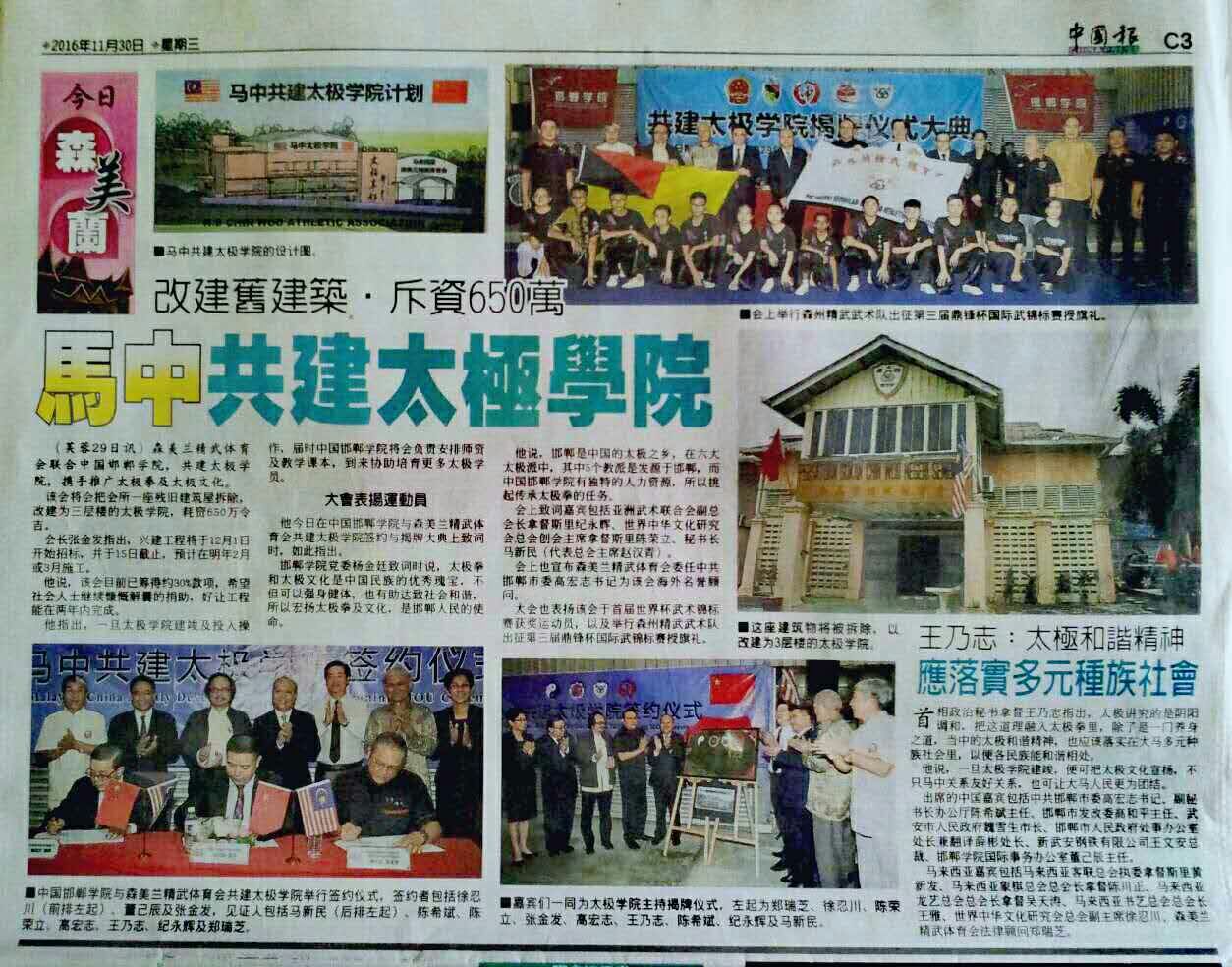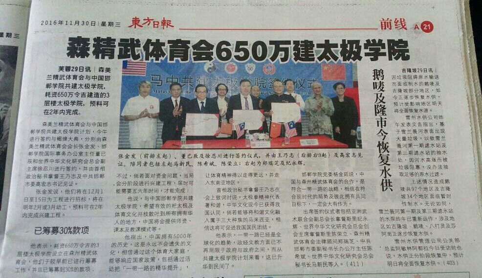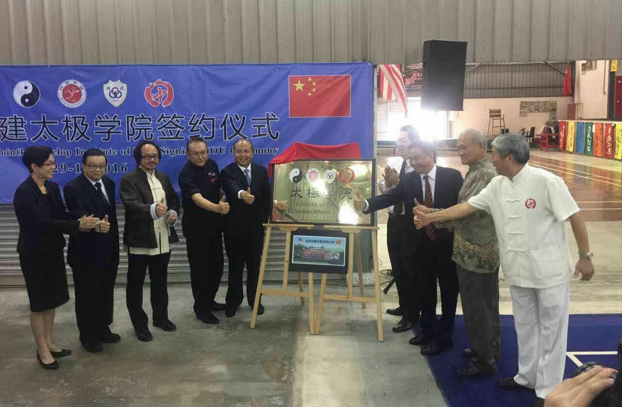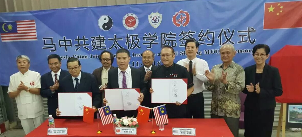 据马来西亚《中国报》《东方日报》2016年11月30日讯:马中共建太极学院揭牌典礼暨世界中华文化研究会总会、中国邯郸学院、森美兰精武体育会三方合作签约,11月29日在森美兰精武体育会大礼堂盛装举行。