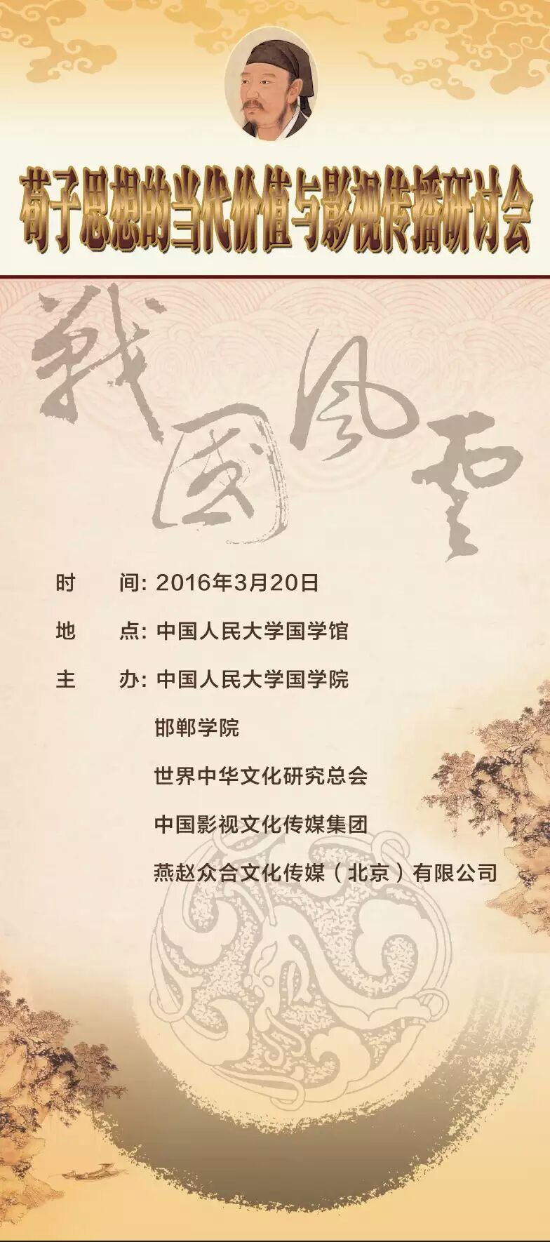 本网讯(记者 马可)3月20日,春风送暖,迎春花开。由总会与中国人民大学国学院、邯郸学院、中国影视文化传媒集团、燕赵众合文化传媒(北京)有限公司再次联合主办的荀子思想的当代价值与影视传播研讨会,在中国人民大学国学馆召开。