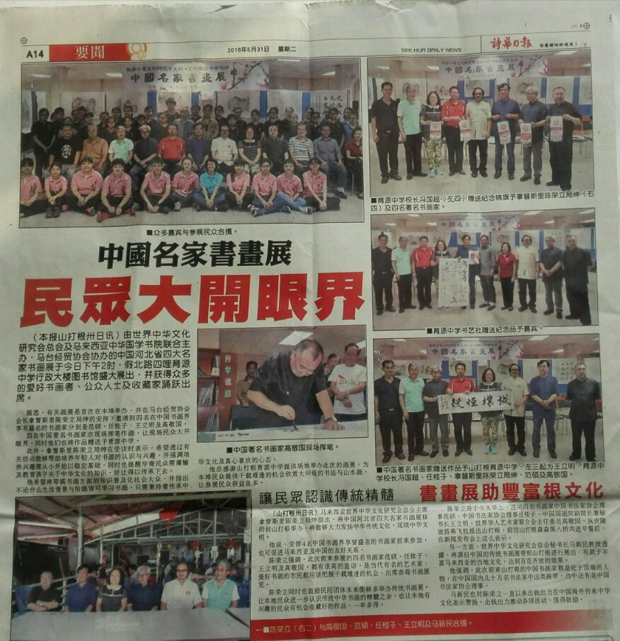 吉隆坡6月3日讯(记者 马可 )由世界中华文化研究会总会与马来西亚中华国学书院联袂主办,马台经贸协会协办的中国名家书画展,于5月27日至6月1日分别在吉隆坡和山打根分两场举行。中国名家书画展展出中国书协理事范硕、任桂子,中国美协会员王立明及河北书协会员高敬国书画作品四十余幅,受到大马民众的热烈欢迎。马来西亚华人主流媒体《星洲日报》《中国报》《自由时报》《诗华日报》等纷纷大幅重点报道了书画展活动。