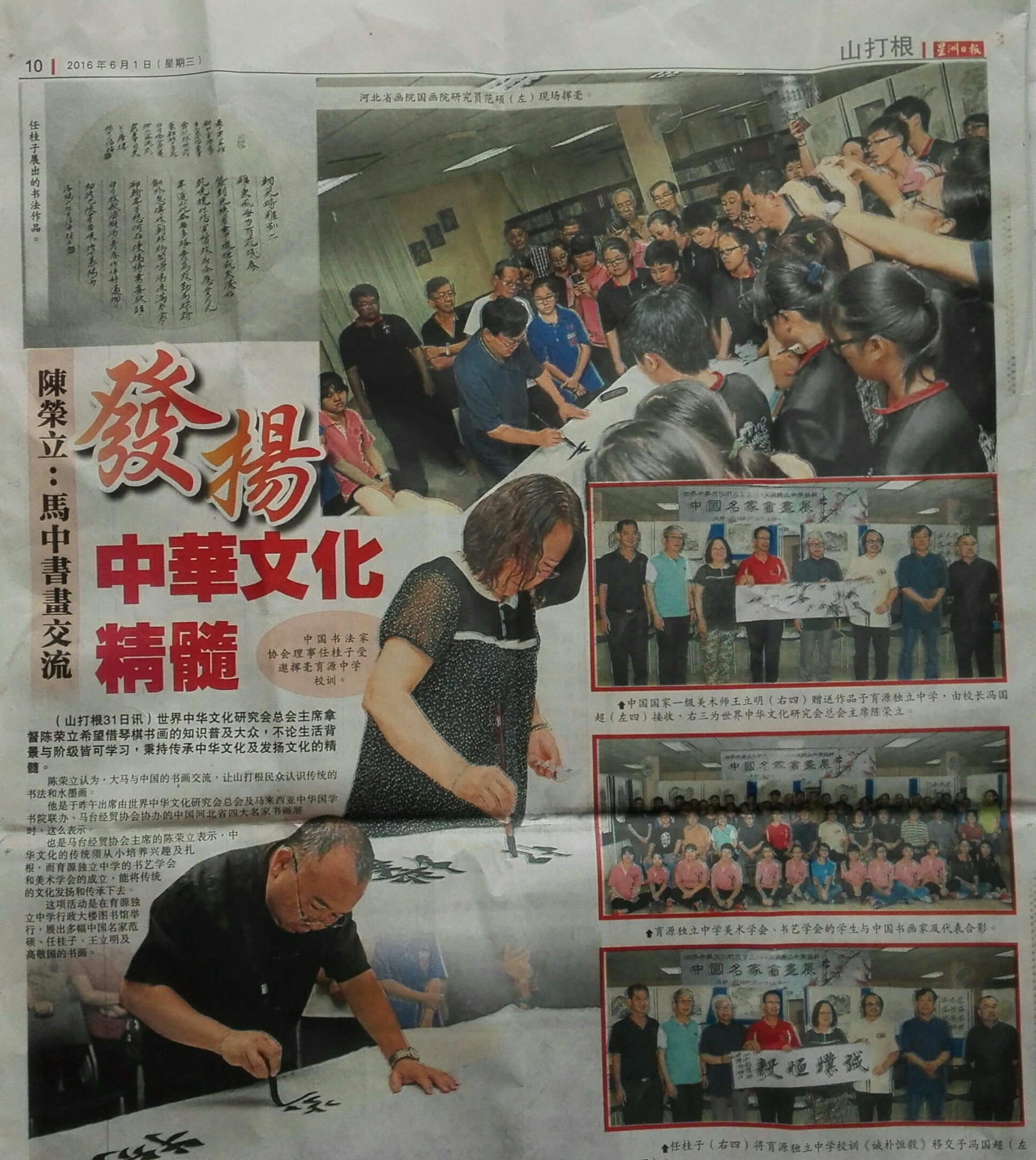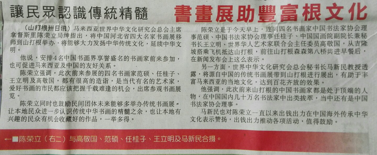 《星洲日报》:发扬中华文化精髓 范硕、任桂子、王立明、高敬国挥毫赠书画山打根育源中学