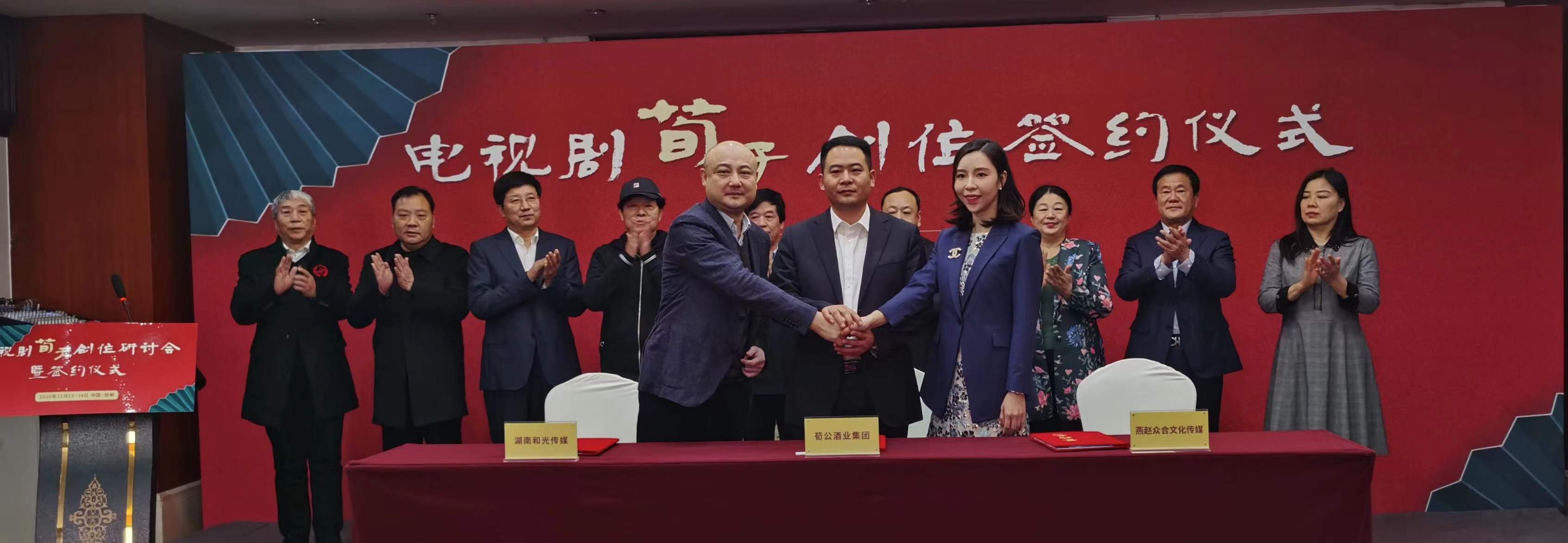 (前排左起为湖南和光传媒总经理邹鹏、荀公酒业集团董事长张军、北京燕赵众合传媒总经理签约成功}